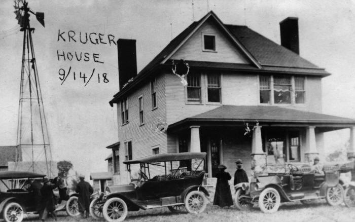 A September 1918 photo shows touring cars parked along Hwy 73 in front of the Krueger house, as curious spectators looked for damage that had been done to the house during the shootout between the United States Marshall and his posse against the Krueger family. |