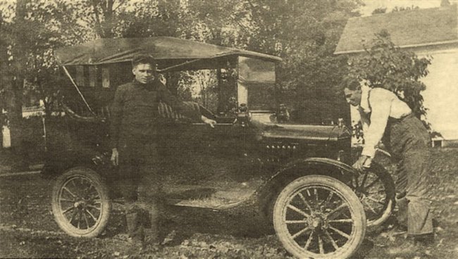 The gasoline engine touring car was manufactured starting in 1910 through 1920s. It came in either a 2-passenger or 4-passenger model. The above photo shows a man cranking the motor to get it started. A cranking tool was carried along in the car for that purpose. If you lost the crank temporarily, there was no way of starting the motor. |