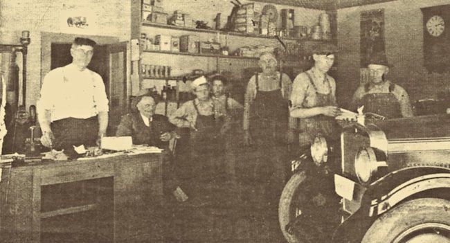Fred Stelloh is shown standing behind a desk in the office of his business located on West Fifth Street, and the gentleman seated on his left is believed to be Arthur Wegner. First, Stelloh maintained an implement sales and repair business, later adding an auto sales and service dealership. The eagle radiator cap ornament shown on the car hood is believed to have been the emblem of a Chevrolet at that time. (Photo courtesy of Steve Roberts) |