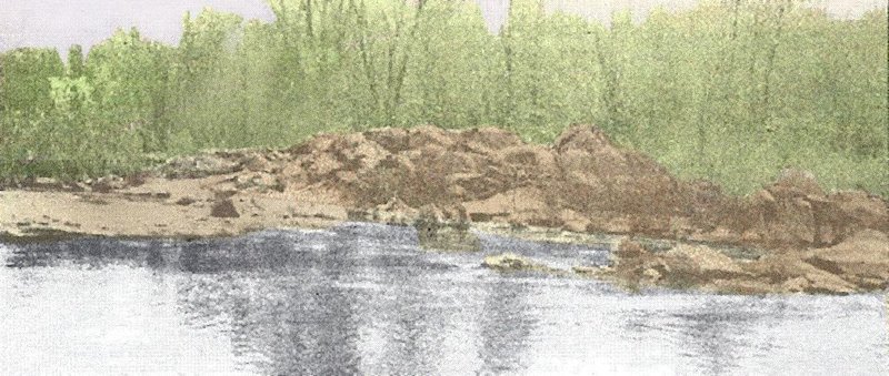 A few large rocks on a riverbank are the only visible remains of the Hemlock Dam site, located one mile south of where the Popple River empties into the Black River. Hemlock derived its name from an island of hemlock trees, which has since washed away. Near the dam was a small hamlet with a sawmill; and a three-run stone gristmill, set up in a four-story high frame building, with many customers who came to have grains ground. |