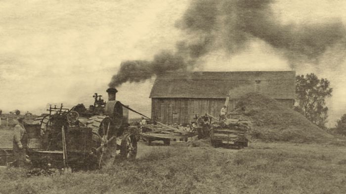 In the early 1930s, small grains were threshed out by using machines such as that shown above. The threshing machine was powered by a large tractor with a drive belt that ran from the tractor to the thresher. The above photo was taken of Alfred Drescher who owned the threshing rig, going from farm to farm in a neighborhood, doing custom threshing with the farmers helping one another, grain hauling and pitching bundles into the threshing machine. |
