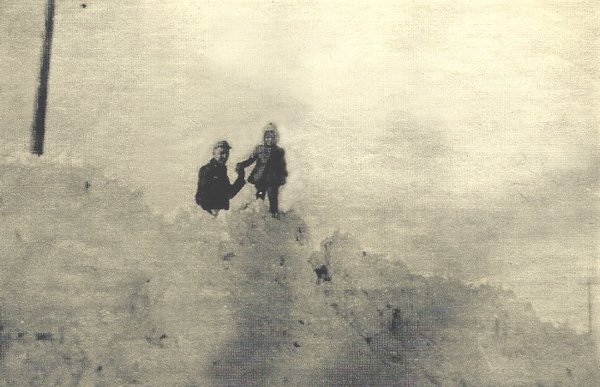 This winter of 1942-43 photo was taken one mile east of Neillsville, U.S. Highway 10, then about three-quarters of a mile south on Owen Avenue. Albert Mashin and his daughter, Joyce (Becker). Are shown standing on top of the snowbank along the side of the road. |