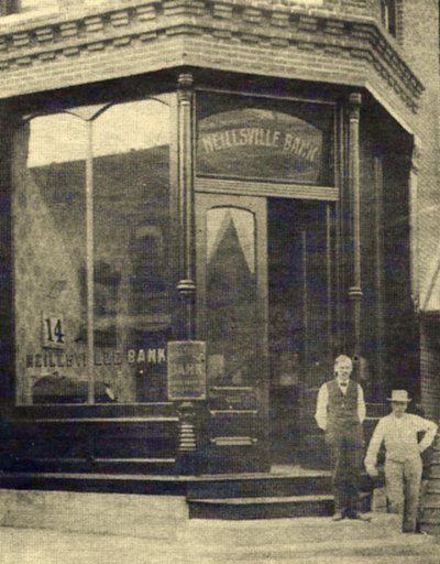 The Neillsville Bank as it appeared in the late 1800s, before being remodeled in later years. The front entrance was located on the northeast corner of the building. The second-floor stairway entrance was on the north side of the building, which is partially visible at the right in the photo. |