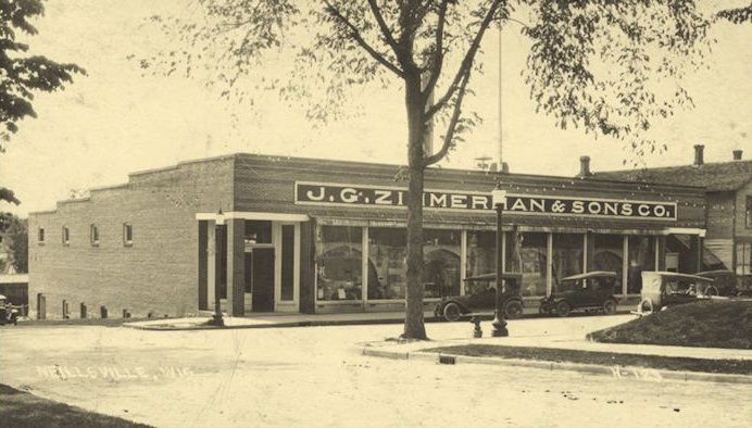 Above is a photo of the J.G. Zimmerman & Sons store as it appeared in the 1930s. The department store business was in the building on the northwest corner of Hewett and Fourth Streets. Clothing, shoes and groceries were sold on the first floor, with hardware items being in the basement of the building. |