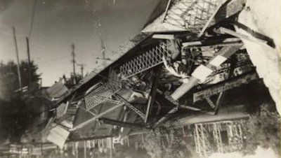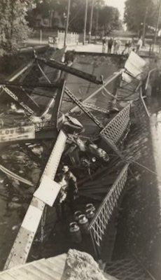 (The Hewett Street Bridge collapsed as Walter Aumann drove his truck, loaded with 80 cans of skim milk, over the bridge. Fortunately, Aumann escaped with only minor injuries as the bridge crashed under and about his truck. Pieces of the steel overhead structure crashed against the truck, wrecking it completely. DZ)