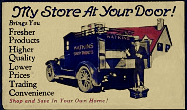 seasonings and ointments. Watkins advertised as being a Store on Wheels,