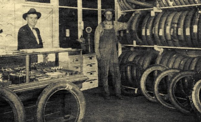 Len Howard owned and operated a tire shop on the southwest corner of the West Fifth and West Street corner in the early 1900s. He is shown standing behind the counter and an unidentified employee is standing nearby. |
