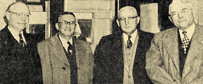 This picture was taken in Neillsville in March 1952, when Senator Robert A. Taft was in Clark County to campaign for the primaries. In this picture Senator Taft is at the extreme left, with former Mayor Leo Foster next to the right, then Harvey Higley and O.W. Trindal, chairman of the county Taft committee.