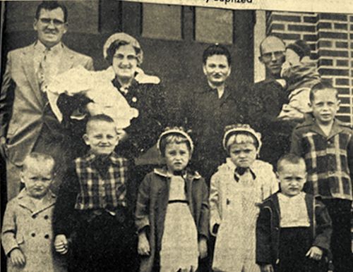 Per The Press, October 17, 1957: "All eight youngsters of Mr. and Mrs. Harold Langreck of Neillsville, Rt. 1, were baptized in a ceremony at St. Mary's Catholic Church here Sunday afternoon by the Rev. Joseph Eisemann. They ranged from seven years of age down to seven days. Sponsors were Mr. and Mrs. Walter Larsen, neighbors, who are shown in the picture taken on the steps of St. Mary's church immediately after the ceremony. In the picture, front row, are (l. to r.) James, 3; Gerald, 6; Diann and Donna, twins, 5; Patrick, 2; and John, 7; and back row Mr. Larsen, Mrs. Larsen holding seven-day old Dennis; Mrs. Langreck and Harold Langreck, holding Daniel, 1." Editor's note: The Press incorrectly reported in 1957 that all eight children were baptized the same day. Dennis was the only one baptized that day. The rest of the children were baptized shortly after birth. |