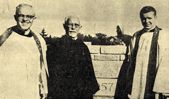 Three Reverends Tanner– Father, Grandfather and son took part in the cornerstone laying ceremonies at the new Calvary Lutheran Church here Sunday afternoon. From left to right they are the father, the Rev. Idar J. Tanner of Calvary Church; the grandfather, Jacob Tanner, S.T.D. (Doctor of Sacred Theology), of Waldorf College in Iowa; and the son, Rev. Ira Tanner, pastor of Our Savior's Lutheran Church at Greenwood. (Press photo Oct. 3, 1957) |