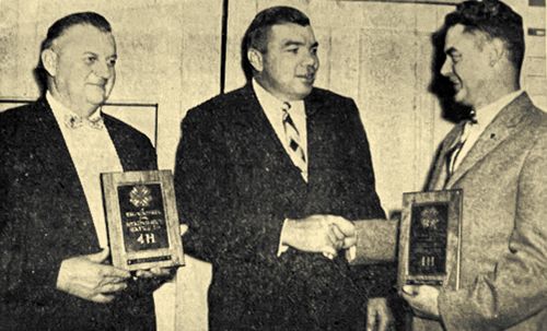 Two important Clark County firms were recognized for meritorious service to 4-H Clubs over the years at the annual 4-H leaders' banquet in Trinity Lutheran Church at Loyal last Thursday evening. Shown with their plaques and being congratulated by County Agent Stanley W. Ihlenfeldt, are Elmer Learman (left) representing Clark Electric Cooperative; and Galen Misfeldt (right) representing the Thorp Finance Corporation. (Press photo 1957) |