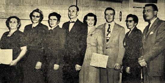 Five Clark County 4-H Clubs were singled out for recognition as outstanding clubs in Clark County during the annual 4-H leaders' banquet in Trinity Lutheran Church, Loyal, last Thursday night. Leaders of these clubs are pictured above (left to right): Mrs. Stephen Tichy of Greenwood, Happy Valley 4-H Club; Mrs. E.C. Haslow of Chili, (pinch-hitting for her daughter, Barbara), Chili 4-H Club; Mr. and Mrs. John Potocnik of Owen, Park's Happy 13 4-H Club; Mr. and Mrs. Robert Blunck of Withee, Longwood 4-H Club; and Mrs. Phyllis Conrad of Withee, Longwood Center 4-H Club. At the right is John Oncken, county 4-H club agent. (Press photo 1957) |