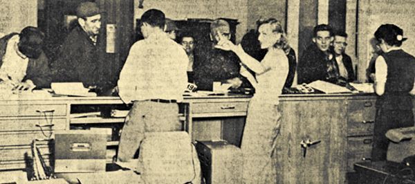 The office of the county clerk, in the courthouse, was without doubt, the busiest place in town from Tuesday until shortly after noon last Friday as hunters made last minute preparations for the opening of the deer season Saturday. Mostly the office was jammed day and evening with hunters securing deer permits, applications, and asking questions about regulations. This picture shows the tag end of the rush, just before noon Friday. With back to the camera are the staff who tried to help the hunters (left to right): Mike Krultz Jr., county clerk; Mrs. Krultz, who was pressed into service and here is explaining a location to a prospective hunter; and Miss Elaine Krause, deputy county clerk. (Press photo 1957) |