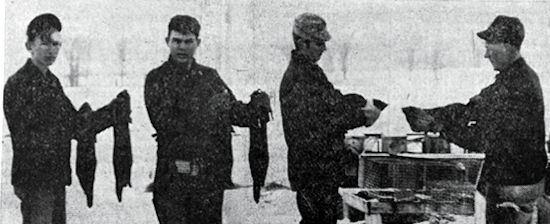 The first step in pelting at the Kurt Marg mink farm. Left to right the workers are Keith Marg, son of Kurt Marg; Harold Zank, Jerry Lewis and Louis Hause. (Press photo 1957) |