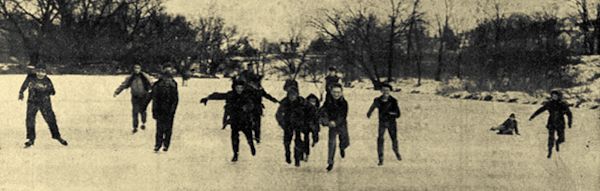 One of the busiest places these days after school and weekends is the O’Neill Creek pond, beside the American Legion Hall. One of the finest natural ice-skating facilities to be found anywhere, the Neillsville rink attracts upward of 100 youngsters at a time during this season of the year. The kids take plenty of bumps while learning, but they have a mountain of healthful, outdoors fun. The photo above shows a few of those there last Saturday afternoon. Presiding over the pond and warming house is Arthur Flynn, whose years of experience as high school custodian make him a rare “find” for the job. The kids like Mr. Flynn, and he likes them, so everybody gets along very well indeed. (Press photo Dec. 12, 1957) |