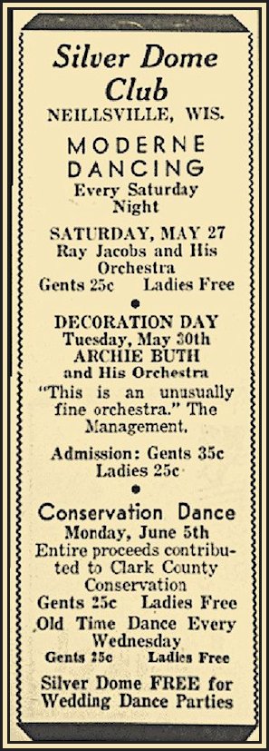 The ballroom was decorated with hundreds of high streamers, with silver and old rose, the senior class colors, predominating. Arising from a central point high above the center of the dance floor, the streamers formed a canopy over the entire floor with an archway to the stage. The stage, on which the collegiate band from Stevens Point State Teacher’s College played carried out the principal scheme of decorations.