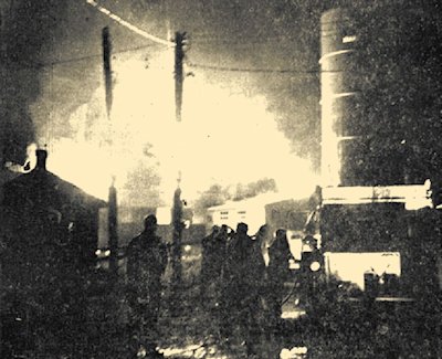 Within 10 minutes of their arrival, the flames had spread throughout the structure, and the sky with low overhanging clouds was a cherry red visible for several miles.