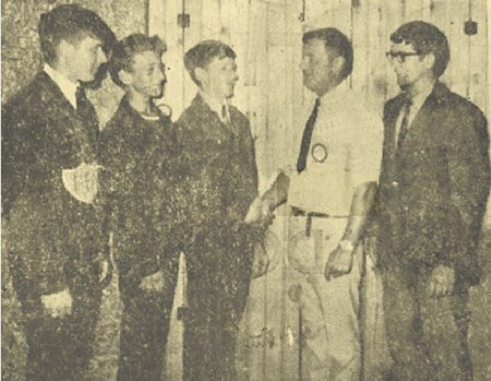 This year’s Rotary Swine recipients are l to r – Richard Kuhn, Mike Mitte, William Kernz and Glen Luchterhand (not shown). Shaking hands with William Kernz is Dr. Jenkins, president of the Neillsville Rotary Club. Looking on is Herman Seebandt, FFA advisor and Vo. Ag. instructor. Each recipient receives four gifts from the Rotary Club and in return he provides four gifts for one of next year’s recipients. (Press photo September 26, 1971). |