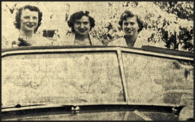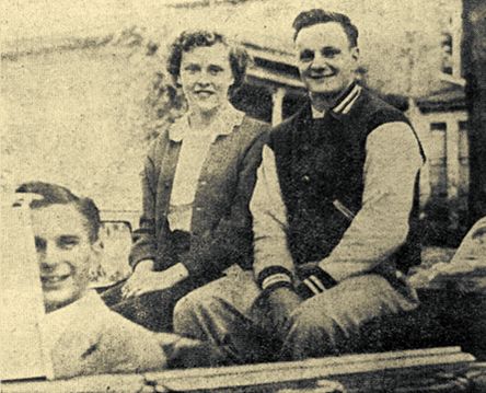 Hans Harder, elected king of homecoming, and the queen he chose, Donna Rae Peterson. The smiling young man at the wheel is Howard Sturtz, who does alright with his beautiful new convertible. (Press photo October 16, 1952)