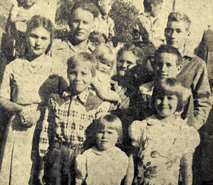 The Orville Schafer family of Pittsville took the honors in the big family contest Saturday, with nine members. They are left to right: Back row - Nettie, 16, Mr. Schafer, Mrs. Schafer holding Paula, 2, Calvin, 15. Front: Laurence, 11, Neda, 5, Alice, 9, and Wayne Earl, 14. (Press photo October 16, 1952)