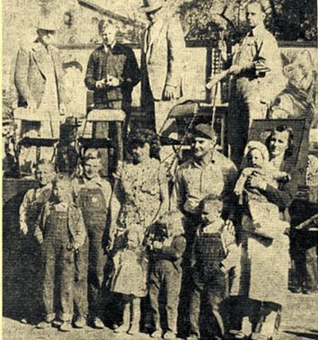 This family, consisting of eight, was the runner-up in the big family contest. Left to right: Back row, Raymond, 10, Robert, 11, Kathleen, 16, Mr. Reinhart, Mrs. Reinhart holding Linda, 8 mos. Front row: Kenneth, 8, Joanne, 2, Mary Ann, 4, Larry, 5. This picture was taken in front of the headquarters truck, upon which are standing, left to right. H.H. Van Gorden, the Rev. Virgil Nulton, the Rev. William Koehler and John Bergemann. This celebration was the first big job and marked achievement of Mr. Bergemann as secretary of the chamber of commerce. (Press photo October 16, 1952)