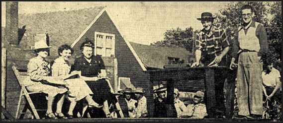 Strategic center of the parade at Granton. Seated at the left are the judges: Miss Pearl Beeckler, Mrs. Gordon Vine and Mrs. Donald Hughes. At the extreme right is Francis Steiner, chairman of the celebration and director of the parade. Mr. Steiner acted as master of ceremonies and gave each feature of the parade an adequate introduction and description, as it proceeded slowly down the main street. With Mr. Steiner, behind the table, is his assistant, Ronald Bartsch, who helped Mr. Steiner identify the entries. The Fall Festival of Granton was notable for its efficient management and showmanship. Associated with Mr. Steiner in the leadership was Durward Schwarze, to whom Mr. Steiner paid public tribute. (Press photo October 2, 1952)
