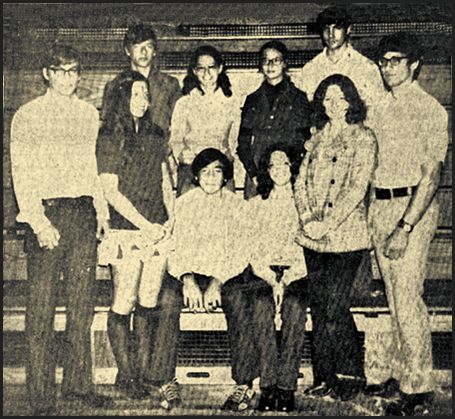 Homecoming King and Queen, Jim Larsen and Mary Alice Schield (seated), are surrounded by members of their court. From the left, they are Jay Emling and Lori Opelt, Jan Barse and Mark Kuchenbecker, Dave Opelt and Sandy Zimmerman, and Carla Zilk and Glenn Kuehnel. (Press photo October 5, 1972)