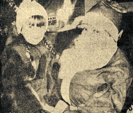 The officers and lone buck private of the “32nd Division” and its nurses’ corps are shown above as they took time off from maneuvers to have their picture taken. Nurses’ corps is distinguished by Red Cross headdress. From staff held by Lt. Col. Donald Ayers flies regimental flag, a black skull and crossbones on white background. General Robert Eggiman, extreme right stands at attention beneath a large American flag flying from a cane fish pole staff. Left to right (top): Lt. Col. Ayers, Capt. Joan Ayers, Mstr. Sgt. Charlotte Ayers, Sgt. Carol Thompson, Lt. Lilalee Cook, Lt. Dorothy Thompson, Capt. Patty Tibbett, Col. Dick Tibbett and Gen. Eggiman. Bottom row, left to right: Corp. Melvin Ayers, Capt. Tommy Tibbett, Mstr. Sgt. Norman Thompson, Buck Pvt. Kieth Marden, Maj. Dick Cook, and Lt. Wendell Ayers. (Press photo Nov. 12, 1942)