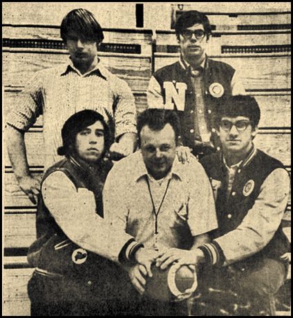 Coach Harlen Sunsdahl of the Neillsville High School football Warriors gathered with his four all-conference players, selected by coaches of the eastern Cloverbelt. Clockwise, from the left, they are Jim Larsen, one of two unanimous choices; David Michalak, junior, chosen and captain of the 1973 team; Jay Emling, senior quarterback; and Mark Kuchenbecker, senior linebacker and end. (Press photo Nov. 9, 1972)