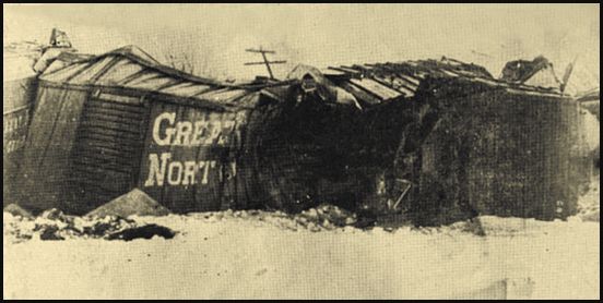 Wrinkled like the bellows on an accordion, the Great Northern railway car in the picture indicated the force with which the car jammed into one ahead of it in a pileup of 27 freight cars which left the tracks at Fairchild Monday. There were 14 cars in this cluster, mostly filled with grain. The road crossings in Fairchild were blocked by wreckage. The accident occurred about 5:30 a.m. The cause was unknown. (Press photo Feb. 24, 1972) |