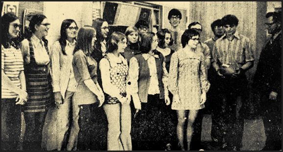 An autographed Green Bay Packer football, held by Roger Volovsek, was presented to a group of Greenwood High School students by Sheriff David Bertz (far right), director of the Clark County Chapter of the March of Dimes, in appreciation of their fund raising activities. Donna Gosar (far left) was chairman of the committee of National Honor Society and Student Council members (center) who helped raise $550 for the March of Dimes. (Florence Garbush photo, March 30, 1972) |