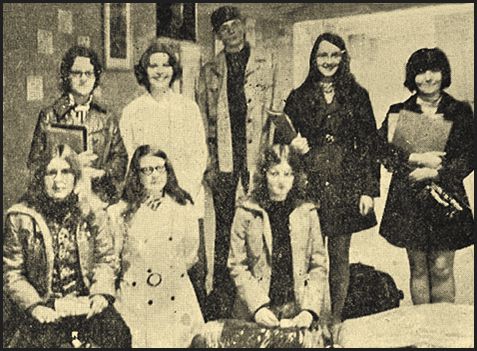 Packed and ready for their trip last Friday afternoon to Madison and the state forensic competition were these Neillsville high school students who received A ratings in the recent district competition. Kneeling are Nancy Roberts, Virginia Spiegel and Candace Sturtz; and standing, Mary King, Linda Diers, Paul Vine, Leila Strangfeld and Ohla Holoyda. (Press photo April 27, 1972) |