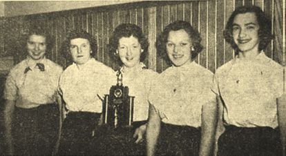 Shown holding the state trophy, which Neillsville bowling teams will keep permanently, are the freshman girls’ bowling team, which won the state and national Junior Bowling Congress tournaments recently. Left to right are Charlotte Covell, Terry Manderfield, Marilou Heaney, Dorothy Hart and Carol Nauertz. (Press photo, April 3, 1952) |
