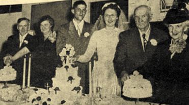 Triple wedding observance. Pictured above are Mr. and Mrs. Robert Charles Prust, who were married recently at Chili. Their wedding day also marked the 62nd wedding anniversary of the bride’s grandparents, Mrs. and Mrs. Irving Drescher, and the 20th wedding anniversary of the bride’s parents, Mr. and Mrs. Ervin Drescher of Chili. The bride is the former Miss Joan Elizabeth Drescher. Left to right cutting their anniversary cakes are Mr. and Mrs. Ervin Drescher, Mr. and Mrs. Robert Prust, and Mr. and Mrs. Irving Drescher. The young people will reside on the groom’s farm near Spencer. (Press photo May 15, 1952) |