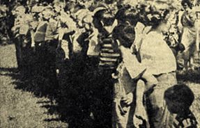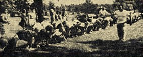 The idea of this Izzy dizzy race was that each youngster should deftly grab himself by the back of the ankles, turn around three times and then run, still with hands upon ankles, to the goal. The winner of this event was Carol Keskimaki of Withee Route 2. Carol is the daughter of Mr. and Mrs. Martin Keskimaki. Runners-up in this fantastic race were Barbara Johnson, daughter of Dr. John W. Johnson of Withee; Caroline Edna Kramer, daughter of Mr. and Mrs. Charles Kramer of Loyal Route 1; and Dorothy Dietsche, daughter of Mr. and Mrs. Frank Dietsche of Spencer Route 2. Picture in the middle photo is Jane Kramer, daughter of Mr. and Mrs. Charles Kramer of Loyal Rt. 1, and Norman Purgett, son of Mr. and Mrs. Ray Purgett of Owen Rt. 2. These youngsters won the back-to-back race, which was one of the most exciting events of the day. In this race all the contestants paired off and locked arms in the manner shown in the picture. Then they raced to a line in one directions, and raced back to the starting point. If any grownups think this is an easy stunt, it might be well to knock off everything else right at this point and take a try at it. The bottom picture shows the youngsters paired off and lined up, with arms locked, ready to start in the back-to-back race. The picnic was a big event, with an estimated attendance of 1,200 to 1,500. The day was fair but windy, following the rain of the preceding night. (Press photo June 12, 1952)