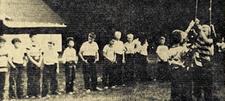 Cub Scouts lower the flag at Higichari. Left to right: John Hubing, Johnny Ziegler, Dennis Gault, Billy Holt, Terry Ormond, Billy Simek, Dennis Gall, John Moen, Billy Perrine, Dennis Brown, Brian Schmidt (behind Dennis), Basil O’Reilly; taking down the flag, Jerry Overman and Jerry Meisner; Tommy Cummings. Those not visible in the picture were Michael Prock, Jerry Ziegler, Jimmy Wasserburger and Alan Cummings. Behind the post and to the right, not shown in this view, were also Jackie Tibbett, Milton Prock, Jim Haas, Larry Smith and Diane Seif. (Press photo July 10, 1952)