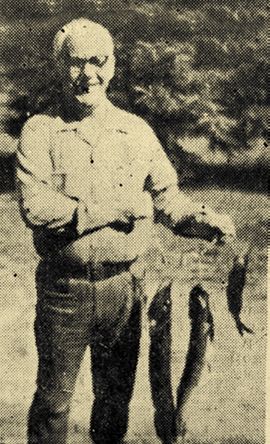 Jack Ebbe proudly displays fish he and his grandson, Steven, caught at the mouth of Wedges Creek on Black River recently. They included two northern and a walleyed pike. (Press photo July 13, 1972)