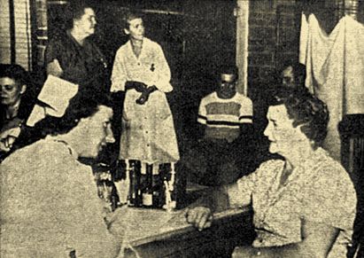 An important preliminary stage in taking blood. In the foreground, at right, Mrs. Fred Appleyard, a donor; at extreme left, partially showing, another donor, Mrs. John Apfel. Standing at left, is Mrs. Elizabeth Helwig, important factor in the success of the drive; at her right, Mrs. Dorothy Smith, general chairman.