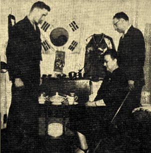 Local sailor, home from a year at the front, brought himself back to his family, and brought many other things, including several pieces of shrapnel, buried within him and not visible in this picture. You see his mother, Mrs. L. J. Chapman, seated, and his father standing at the right. On the wall back of Bud’s head is a Korean flag, given him by a friendly South Korean. Pinned to the bottom of the flag is the embroidered scarf, given him by the mother of the Korean boy whom he befriended. To the right is a fancy embroidered coat of silk, bought in Japan, and behind Bud is a silk dressing gown which cost him $3. On the lower stand are pieces from the large set of Noritake China which Bud bought in Japan for his mother. On the radio at the rear are various items of brass, including two opium pipes and two spoons, taken from North Koreans. (Press photo July 3, 1952)