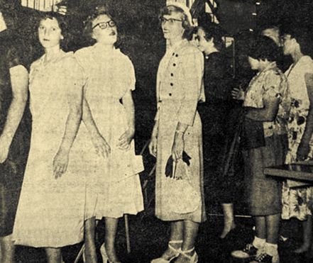 Waiting to model in the 4H dress revue are left to right: Natalie Scherf, Withee; LaVaun Neeb, Loyal; Janice Tews, Neillsville; Jeanette Stirmel, Greenwood; Jean Vogel, Loyal; Pat Browe, Chili; Mary Auman, Neillsville. (Press photo Aug. 7, 1952)