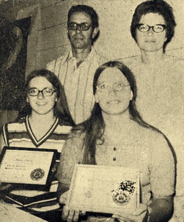 Susan Smith and Kay Alperstett, recipients, respectively, of the 1972 4H and Homemaker Memorial scholarship and of the Clark County Extension Homemaker scholarship, display the framed certificates presented to them by Gerald Luchterhand of R. 2, Spencer, president of the 4H Leaders Federation, and Mrs. Darrel Horn of Greenwood, cochairman of the Extension Homemaker Family Life, Youth and Scholarship committee. Miss Smith is the daughter of Mr. and Mrs. Vernon Smith of Rt. 1, Greenwood. Miss Alperstett’s parents are Mr. and Mrs. Melvin Alperstett of Rt. 3, Greenwood. (Press photo August 17, 1972)