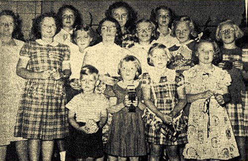 Winners of the Junior Flower show are left to right, top row: Shari Briggs, Kay Overman, Marilyn Wildish, Luann Hubing. Middle row: Mary Briggs, Carolyn Marg, Kathryn Manz, Mary Manz, Sharon Dux, Doris Dux. Front row: Paul Nulton, Jill Briggs, Juliana Rosenbaum, Donna Lee Groth. (Press photo August 28, 1952)