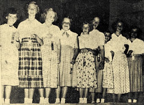 These girls are winners at the fair in the skirt and blouse class for girls under 14, many of them only 10 years old. Left to right: Jacqueline Foster, Thorp; Marjorie Haines, Neillsville; Rachel Micke, Thorp; Mary Puscheck, Chili; Yvonne Himes, Owen; Sharron Anderson, Withee; Caroline Kramer, Loyal; Sylvia Palmer, Neillsville; Carlotta Tichy, Greenwood. (Press photo August 28, 1952)