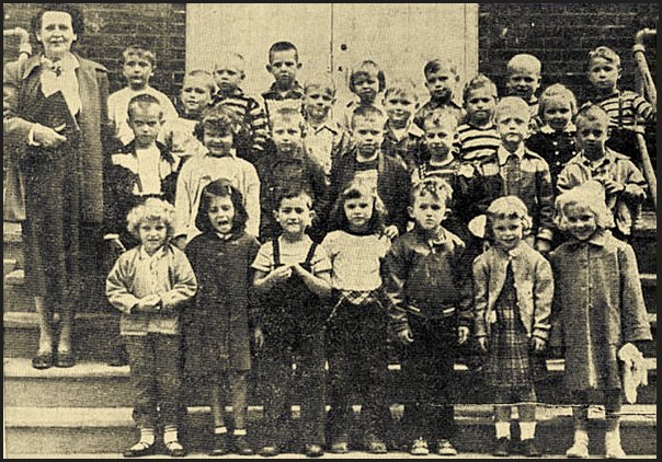 This photo shows Miss Rybicke with the children of the kindergarten class. Bottom row, left to right: Nancy Volz, Lucy Jake, Jerry Horswill, Mary Lee Reams, Richard Zank, Sandra Free, Patsy Zager. Second row: John Raine, Theresa Hagedorn, Jimmy Resong, Jimmy Seif, Roger Ingold, William Nemitz, Gary Zickert. Third row: Steven Gress, Robert Hill, Wayne Gress, David Svetlik, Judy Kren. Fourth row: Jeffrey Gall, Jimmy Imig, Daniel Ferguson, Nellie Freezy, Gerald Howard, Mike Frie, Alan Carl. (Press photo September 25, 1952)