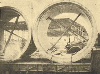 The steel framework of the new Nefco Filter Corporation plant now under construction on Highway 10 East, in Neillsville can be seen through these culverts which will form the sidewalls of a sewage lift station to be installed in front of the plant. The building will be 120 by 300 feet–the size of a football field between goal lines. The Neillsville Industries corporation will undertake to finance 70 percent of the cost of the building, estimated at $150,000, as soon as permission is secured from the state securities department. This permission is being held up pending the resolution of some minor questions between the city, the industries corporation and Nefco. The industrial corporation plans to secure the financing by selling stock and debentures and through loans from the two banks of the city. Incidentally, the two pieces which will form the sidewalls of the lift station are eight feet in inside diameter and weigh an estimated 12,000 pounds each. (Press photo October 24, 1968)