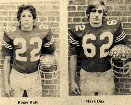 Voted outstanding players by coaches in the Neillsville High School 5029 victory over Greenwood last Friday were Roger Huth on offense and Mark Dux on defense. Huth carried 29 times for 188 yards and four touchdowns. Dux accounted for seven tackles, but his major contribution was in keeping the pressure on Greenwood’s quarterback throughout the game, the coaches said. (Press photo Oct. 23, 1975)
