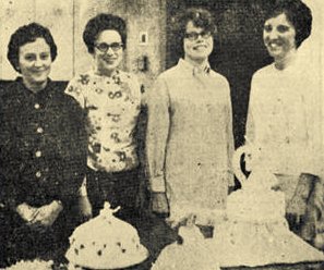Anyone but a fat man would have appreciated the invitation of the adult cake decorating class at Neillsville High School Monday night to have cake and coffee with them; but the photographer was a fat man and could only drool at the likes of the cakes above. The event was held in celebration of the last class period for its 14 members. Showing three of the scrumptious cakes displayed were Mrs. Carol Mortensen, the instructor, and the culinary construction engineers for the cakes in front of them; Arlene Abrahamson, Beverly Schmidt and Sandy Drescher. (Press photo November 14, 1968)