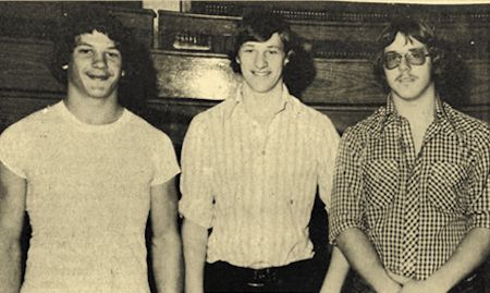Much of the success of next year’s team will depend on the leadership of these three young men, Coach Harlan Sunsdahl remarked as he presented his three co-captains of the 1976 football Warriors this week. They are, left to right: Roger Huth, outstanding tailback on this year’s championship team; Jim Erpenbach, center; and Jeff Kessler, lineman who probably will convert to back field next year. The co-captains were selected by a vote of their teammates. (Press photo November 13, 1975)