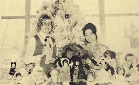 Named winner in the third annual “Dress-a-Doll” contest sponsored by the volunteer Social Services Santa Shop was Mrs. Leiko Gassen (right), Neillsville. Mrs. Gassen’s entry, a Japanese dancing girl complete with Obi sashed kimono, gold fans, and flowered hairdo, was held by Mrs. Jean Derninsky, a volunteer services coordinator. The doll was one of several dressed by members of the Neillsville B & PW Club. All 30 dolls entered in the contest will be donated to the Santa Claus Shop for gift giving. As a prize, Mrs. Gassen was awarded a poinsettia plant by Jenni Floral. (Press photo Dec. 1975)