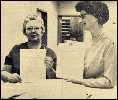 A pile of petitions containing 1,589 signatures and seeking greater protection at rural grade crossings, is displayed here by Mrs. John Slachetka, safety chairman for the Clark County Homemakers Association. With her is Miss Brooks Rector, Clark County home agent, who has been assisting in the project. Several petitions still are outstanding and will swell the total number of signatures. (Press photo Feb. 8. 1968)